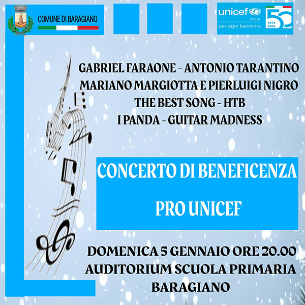 L’Amministrazione Comunale di Baragiano e i cittadini partecipanti al concerto saranno con UNICEF in questi luoghi con i giovani concertisti Gabriel Faraone, Antonio Tarantino, Mariano e Pierluigi Margiotta (veramente grande l’dea di quest’anno degli organizzatori di valorizzare i giovani talenti in un concerto per UNICEF che difende i diritti i dei bambini in tutto il mondo).
