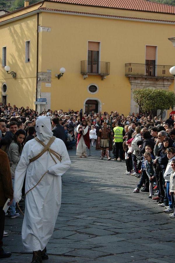 Nelle ore pomeridiane del Venerdì Santo il dramma di Cristo scorre per le vie del paese, la folla assiste a questa pantomima con silenziosa e visibile emozione.
