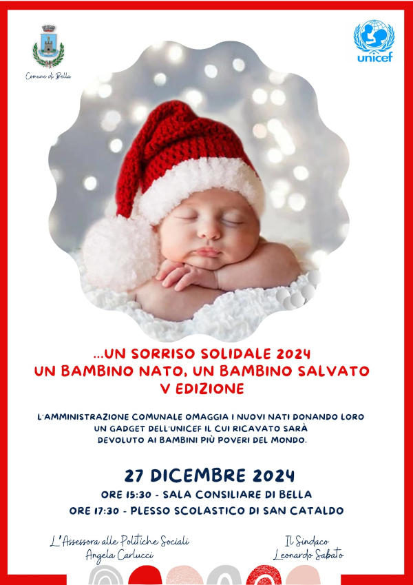 Il 27 dicembre 2024, alle 15,30 nella Sala consiliare di Bella e alle 17.30 nel plesso scolastico di San Cataldo, l’assessora alle politiche sociali del Comune di Bella Angela Carlucci e il sindaco Leonardo Sabato daranno vita alla quinta edizione di “Un sorriso Solidale 2024. Un bambino nato, un bambino salvato con UNICEF”.
