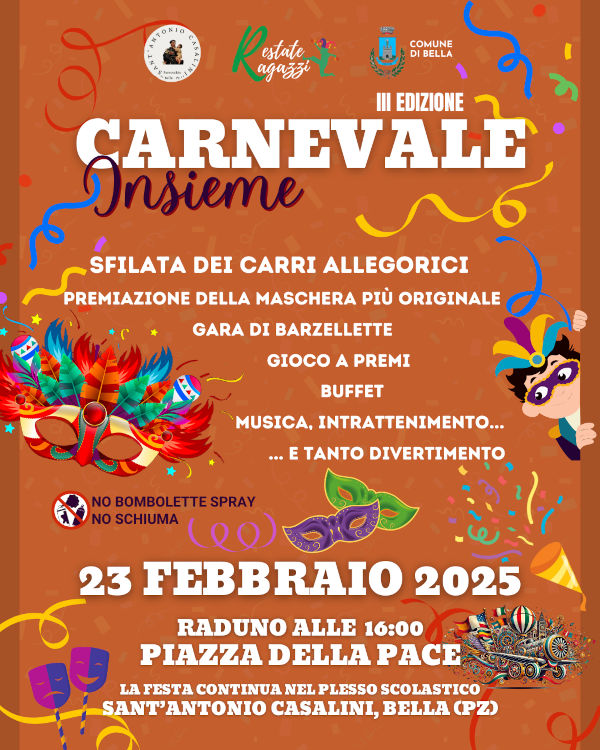 “L’evento si terrà Domenica 23 Febbraio 2025 a Sant’Antonio Casalini di Bella (PZ), con raduno previsto alle ore 16:00 in Piazza della Pace.