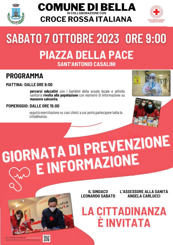 Per educare alla Salute e alla Sicurezza, Sabato 7 Ottobre 2023, in Piazza della Pace a Sant’Antonio Casalimi l’Amministrazione Comunale di Bella organizza una giornata di Prevenzione e Informazione con La Croce Rossa Italiana.