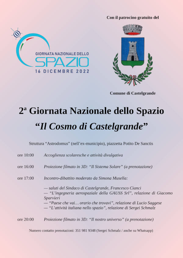 Alla seconda Giornata nazionale dello Spazio, indetta dall’ASI (Agenzia Spaziale Italiana) per il 16 dicembre prossimo, parteciperà anche Castelgrande.