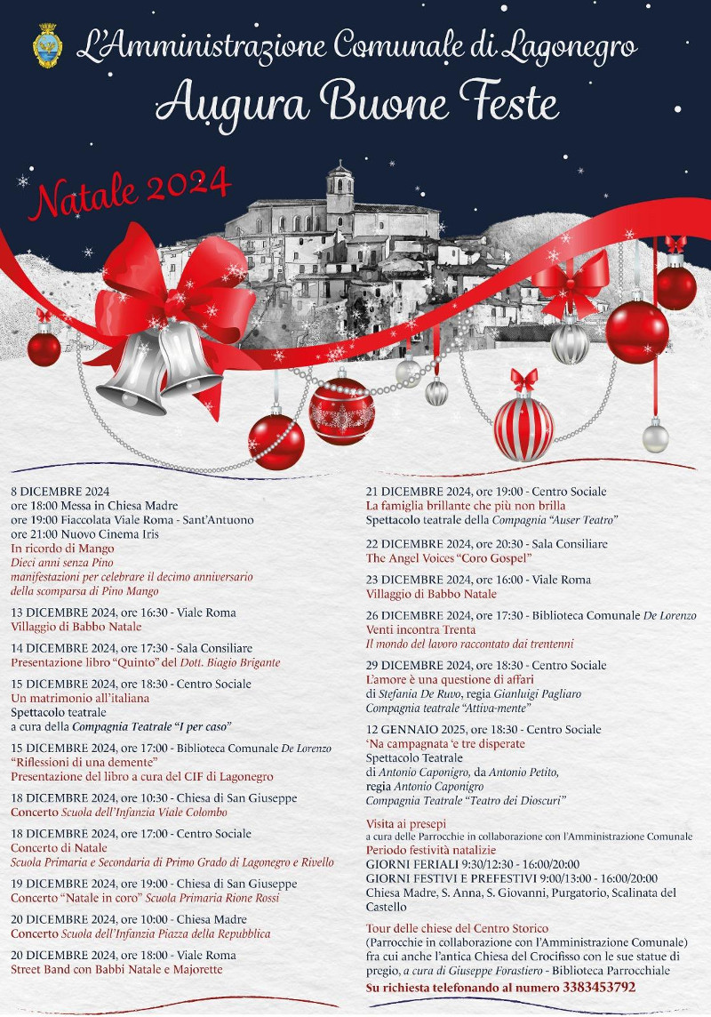 Ricco calendario di eventi e luminarie per il Natale Lagonegrese, a cura degli Assessorati alla Cultura, Spettacolo e Turismo, rispettivamente il Sindaco Salvatore Falabella, la Vicesindaca Daniela Citera e l’Assessora Pina Manzolillo.