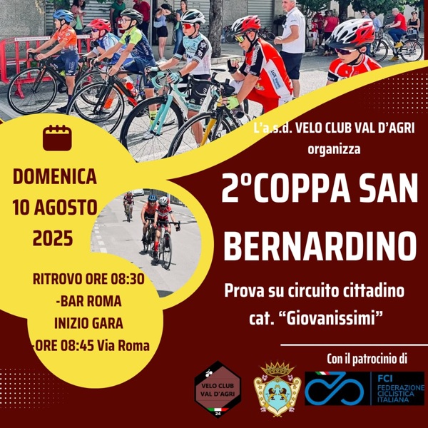 Due ruote in movimento con il Velo Club Val d’Agri che si fa promotore di una giornata dedicata al ciclismo giovanile under 13 con la Coppa San Bernardino in programma domenica 10 agosto a Marsicovetere per il campionato regionale società per giovanissimi sotto l’egida della Delegazione Regionale FCI Basilicata.