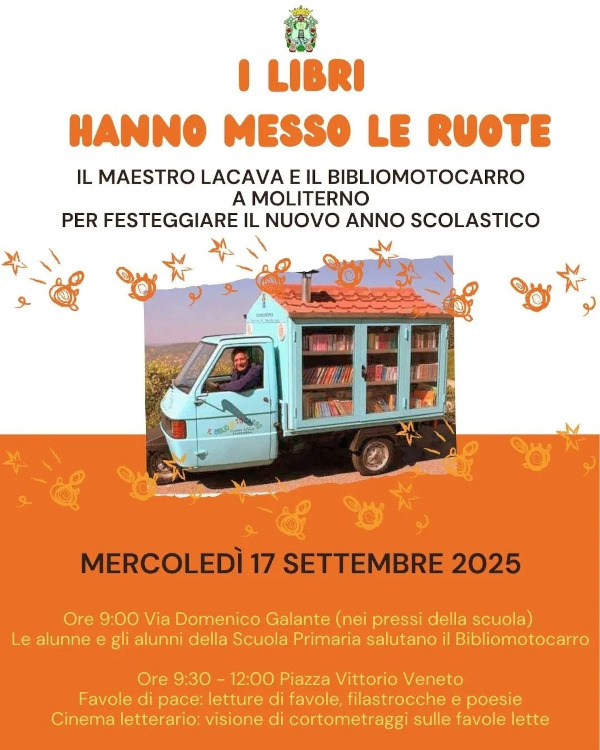 Mercoledì la BiblioMediateca “Giacomo Racioppi” Moliterno saluta il nuovo anno scolastico con il Bibliomotocarro del maestro Lacava.