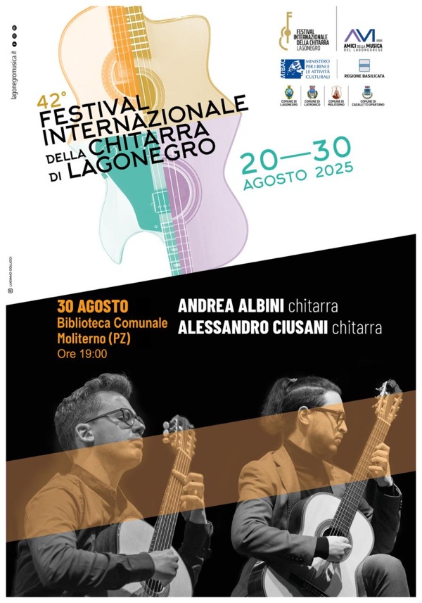 Il 42° Festival Internazionale della Chitarra di Lagonegro si conclude con un appuntamento di grande raffinatezza: Domenica 30 Agosto alle ore 19:00, nel palazzo della Biblioteca Comunale a Moliterno, si esibiranno i giovani chitarristi della Scuola Vercellese Andrea Albini e Alessandro Ciusani, in collaborazione con l’Associazione Culturale Musicale Angelo Gilardino.