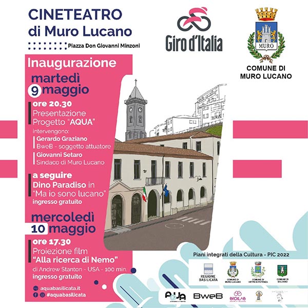 Il giorno 9, per festeggiare il passaggio del Giro d’Italia, all’interno del nuovo Cineteatro comunale, inaugurato per l’occasione, alle ore 20:30, si terrà la presentazione del progetto con gli interventi del sindaco Giovanni Setaro e di Gerardo Graziano della BweB, soggetto attuatore del progetto.
