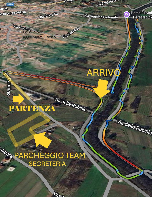 Il percorso costeggia gli argini del fiume Agri (117° in Italia per lunghezza) ed anche dell’affluente Oscuriello con prevalenza di sterrato all’80% più ostacoli naturali e un 20% di tratti in asfalto per uno sviluppo complessivo di 2,8 chilometri e con una doppia zona di assistenza tecnica debitamente segnalata.