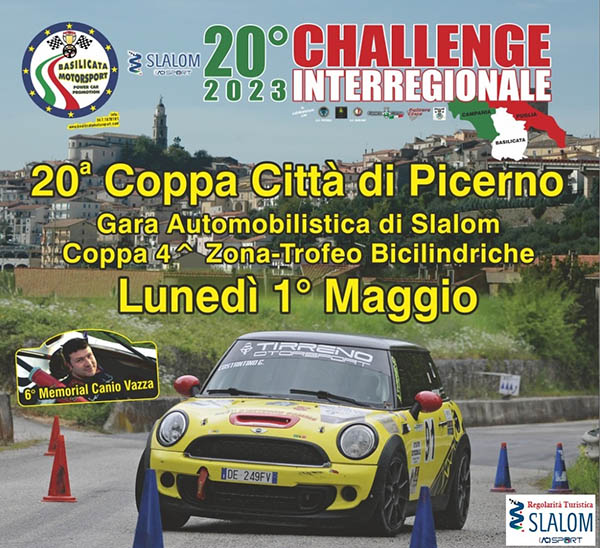 Si festeggia il prossimo Lunedì primo maggio il traguardo della ventesima edizione dello slalom “Coppa Città di Picerno- 5° Memorial C. Vazza”, organizzato dall’Asd Basilicata Motorsport in affiancamento con il Veteran Club Policoro Corse.