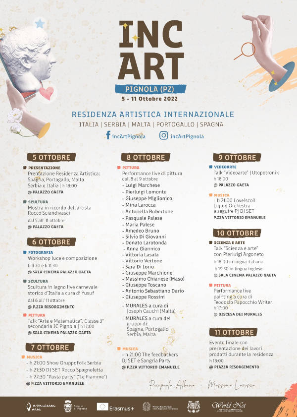 - L’evento continuerà fino al giorno 11 ottobre, giorno in cui saranno illustrati tutti i lavori del progetto in Piazza Risorgimento e vedrà l’organizzazione di corsi di fumetto per i ragazzi della scuola media di Pignola, un workshop di fotografia, due convegni su scienza, arte e matematica, estemporanee di pittura, murales, sarà prodotta nell’arco della settimana una scultura in legno in piazza Risorgimento che raffigurerà la maschera tradizionale di Pignola.