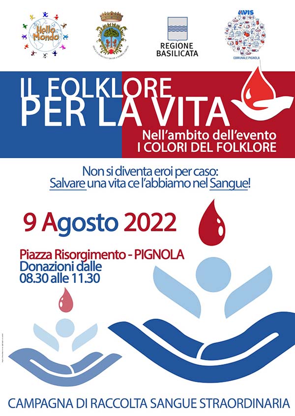 Dalle 8:30 alle 11:30 in Piazza Risorgimento l’associazione Hello Mondo – organizzatrice dell’evento- e l’Avis comunale Pignola sosterranno attraverso una raccolta straordinaria di sangue “Il folklore per la vita” .