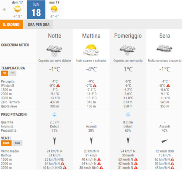La temperatura massima registrata pare che sarà di 1°C, la minima di -4°C.