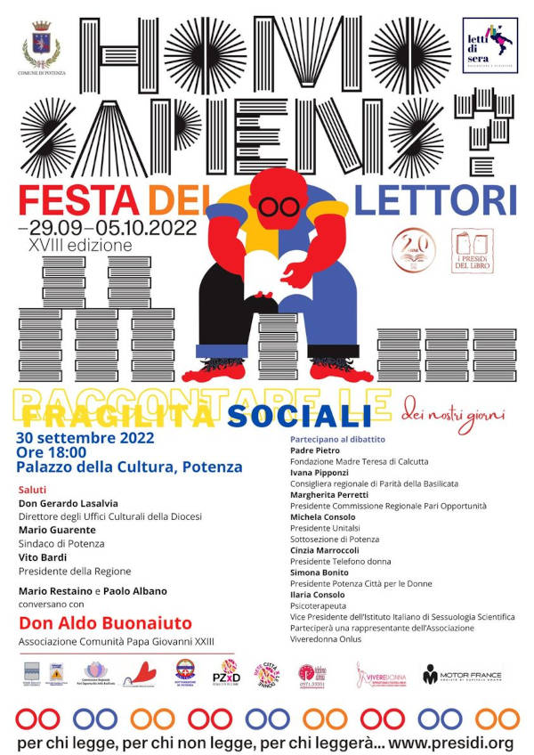 A Potenza sarà don Aldo Bonaiuto, dell’associazione Comunità Giovanni Paolo XXIII, a conversare con il presidente regionale dell’Ordine dei giornalisti Mario Restaino e con Paolo Albano presidente dell’associazione culturale ‘Letti di Sera’, nell’appuntamento ‘Raccontare le fragilità sociali dei nostri giorni’, in programma venerdì 30 settembre 2022, alle ore 18:00, nel Palazzo della Cultura, in via Cesare battisti, 22.
