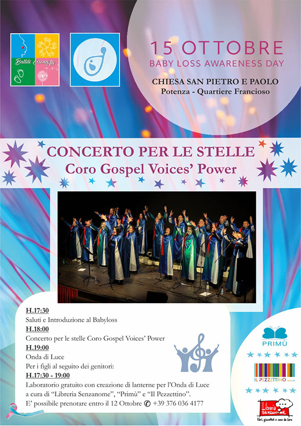 A Potenza l’appuntamento con “Battiti EssenziAli” sarà presso la Chiesa SS. Pietro e Paolo di Potenza, Quartiere Francioso, per ascoltare delle riflessioni sul significato del Babyloss e, soprattutto, per assistere al “Concerto per le Stelle”, tenuto dal Coro Gospel “Voices’ Power” dedicato ai piccoli angeli e ai loro genitori e familiari.