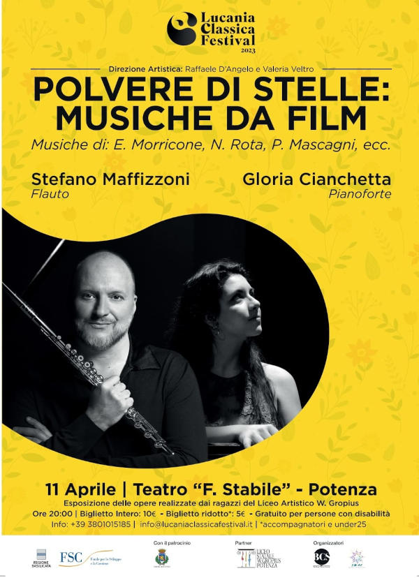 Sarà la prestigiosa cornice del teatro F. Stabile di Potenza ad accogliere l’11 Aprile 2023 la serata all’insegna della buona musica intitolata Polvere di Stelle: musiche da film che farà rivivere le atmosfere delle più note colonne sonore del cinema – e non solo – attraverso la sapiente arte dei professionisti Stefano Maffizzoni (flauto) e Gloria Cianchetta (pianoforte).