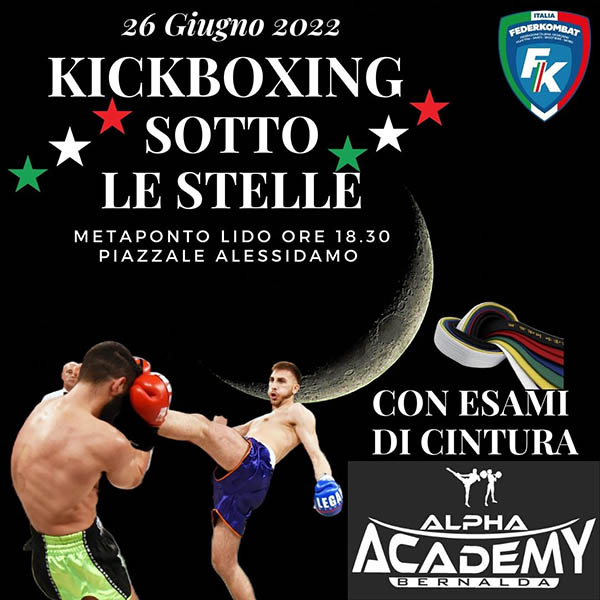Mentre il 26 Giugno saremo impegnati a Metaponto Lido per la manifestazione sportiva Kickboxing sotto le Stelle, evento organizzato dalla Alpha Academy di Bernalda del Maestro Pino Pace, evento aperto a tutti gli atleti tesserati in Federkombat.