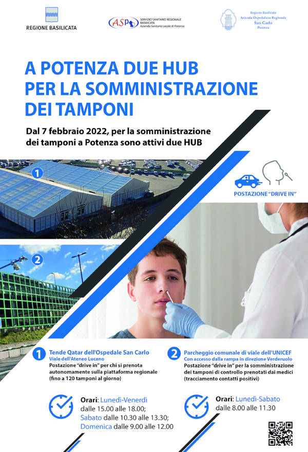 Dal 7 febbraio 2022, per la somministrazione dei tamponi a Potenza sono attivi due HUB: