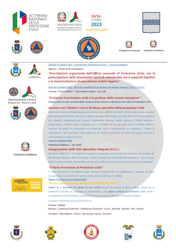 - l’11 ottobre a Matera in piazza delle Costellazioni per un’esercitazione di protezione civile;