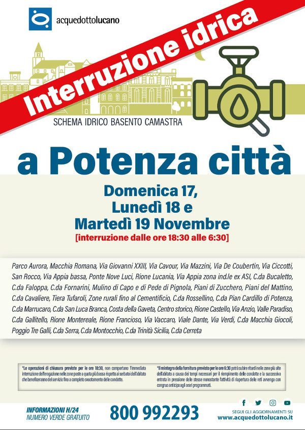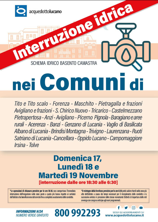 STABILITO IL PROGRAMMA DELLE SOSPENSIONI IDRICHE PROGRAMMATE NEI COMUNI SERVITI DALLO SCHEMA IDRICO BASENTO-CAMASTRA DAL 17 NOVEMBRE AL 19 NOVEMBRE.