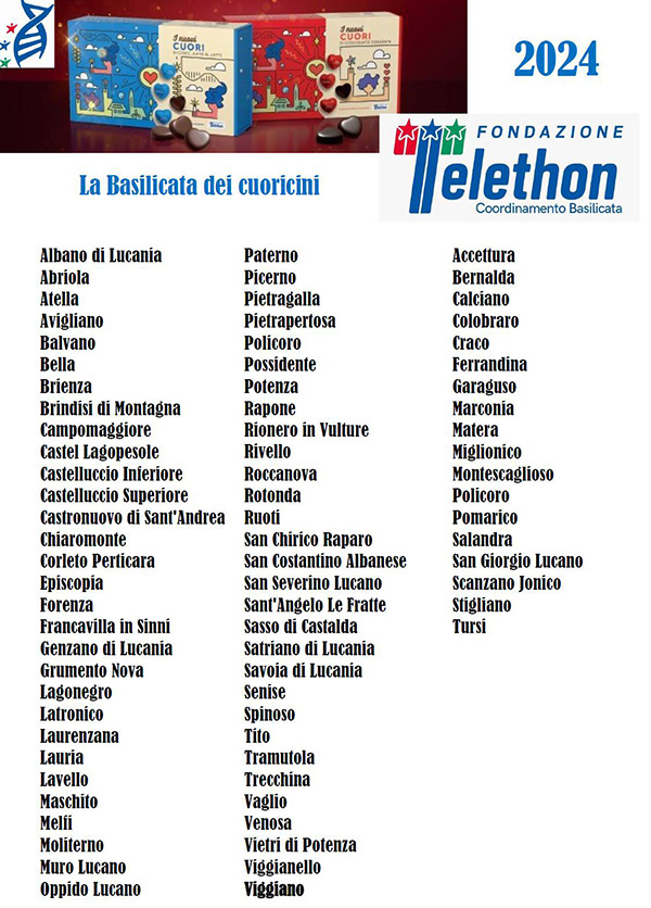Come ogni anno, oltre ai punti vendita principali di Potenza e Matera, anche i piccoli comuni lucani saranno coinvolti, con i volontari di Telethon che allestiranno banchetti nelle piazze per la vendita dei cioccolatini.