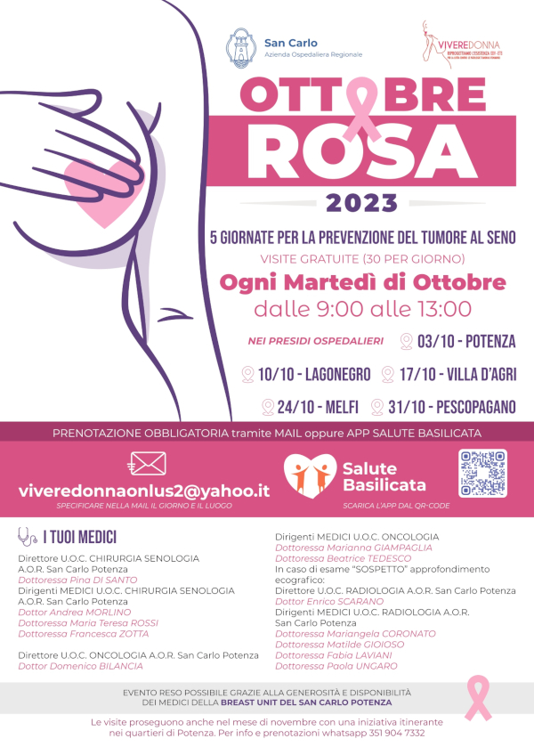 Il Comune di Vietri di Potenza comunica che l’Azienda ospedaliera regionale ‘San Carlo’ di Potenza ha aderito all’annuale campagna nazionale ‘Ottobre rosa’ quale momento di sensibilizzazione dedicato alla prevenzione e cura del tumore al seno: i medici della Breast Unit effettueranno visite gratuite presso tutte le strutture ospedaliere aziendali.