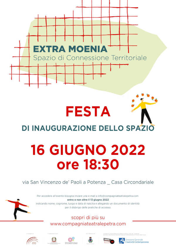 È quello che accadrà giovedì 16 Giugno in via San Vincenzo de’ Paoli, a conclusione del percorso di “Extra Moenia – Spazio di connessione territoriale”, progetto vincitore dell’avviso pubblico Creative Living Lab – 3 edizione promosso dalla Direzione Generale Creatività Contemporanea del Ministero della Cultura, ideato da Compagnia teatrale Petra insieme alla Casa Circondariale “Antonio Santoro” di Potenza e a Officine Officinali APS e con il patrocinio del Comune di Potenza.