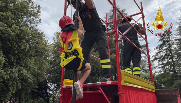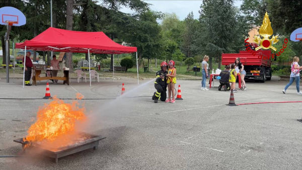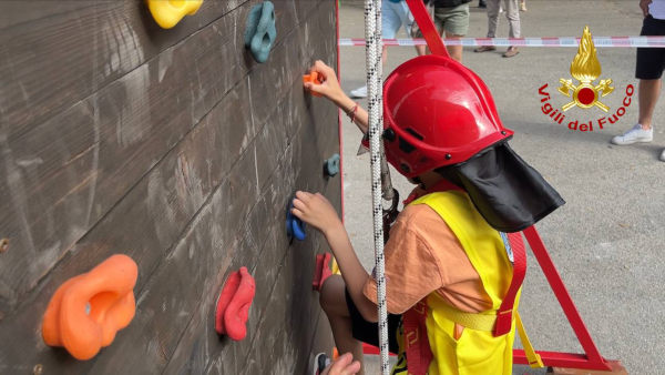 I bambini indossano una pettorina, un imbraco, un casco e seguono un percorso aiutati dai vigili del fuoco, al termine spengono un vero incendio.
