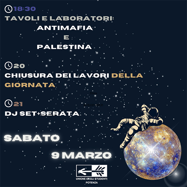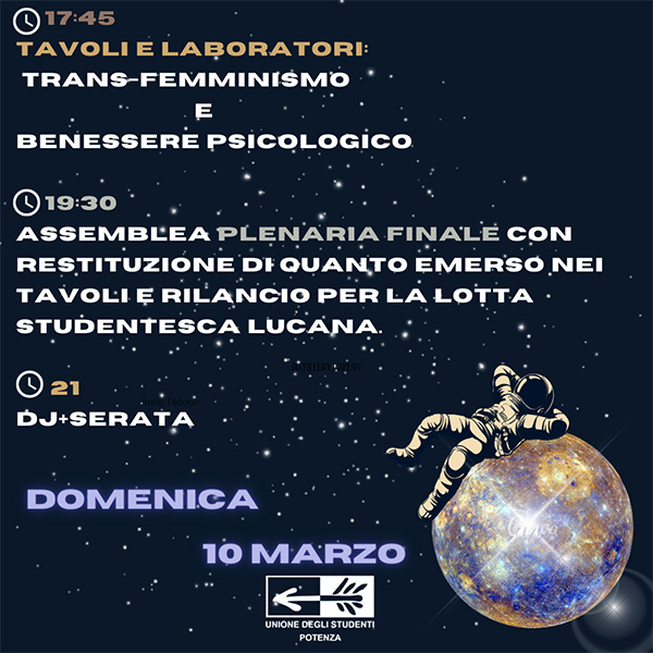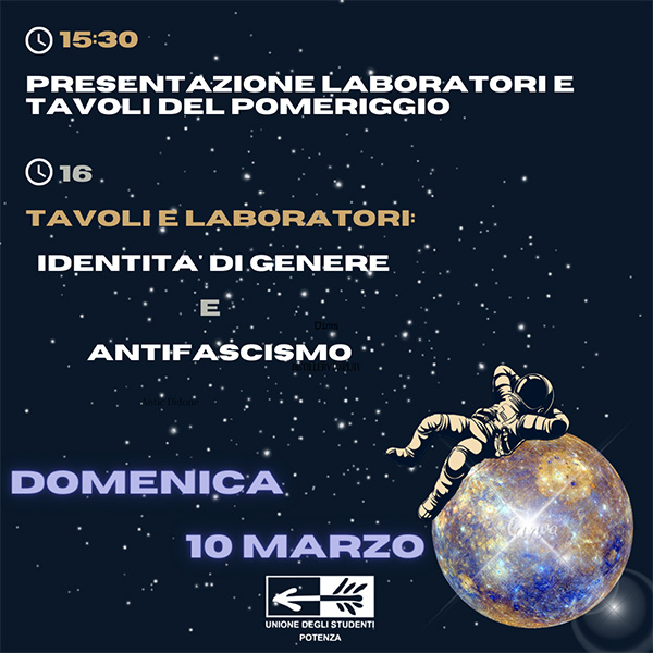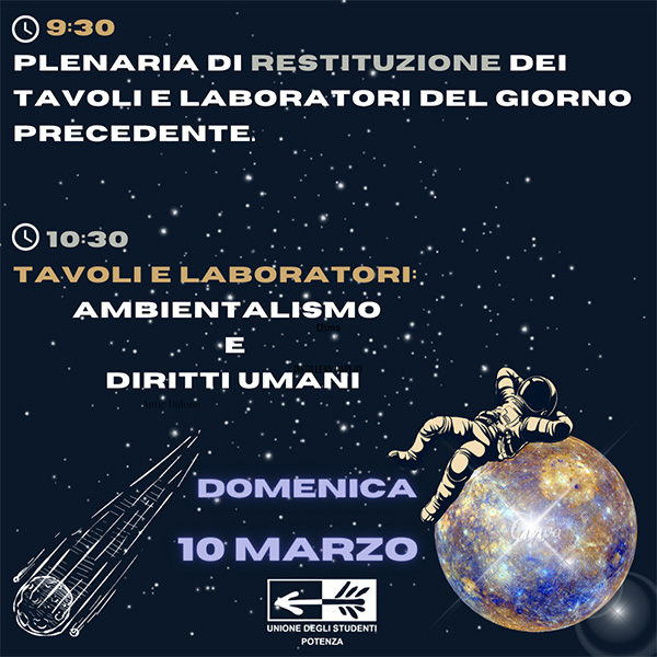 Si comincerà Sabato 9 Marzo alle 16:00 con la riunione della “plenaria” dopo la quale si costituiranno tavoli di lavoro con le associazioni Le Rose di Atacama (sulla lotta contro il razzismo), l’Anpi (l’antifascismo), Libera (mafie e legalità in Basilicata) e Startnet.