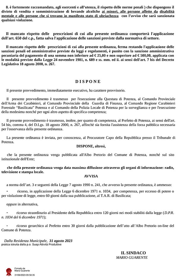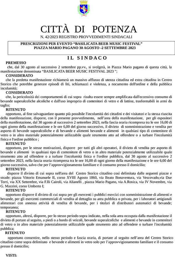 “Divieto di vendita e somministrazione di bevande superalcoliche e divieto di vendita e cessione di alimenti e bevande in contenitori di vetro, alluminio o altro materiale potenzialmente pericoloso agli operatori che esercitano la somministrazione temporanea nell’area occupata dalla manifestazione “BASILICATA BEER MUSIC FESTIVAL” dal 30 agosto al 2 settembre 2023, nella fascia oraria ricompresa tra le ore 16,00 di ogni giorno della manifestazione e le ore 6,00 del giorno successivo.