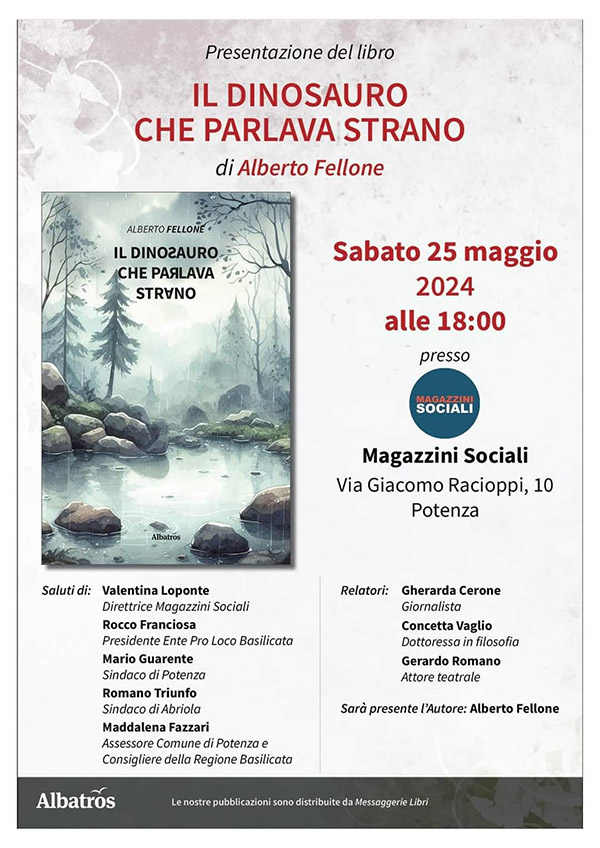 Sarà presentato Sabato 25 Maggio 2024 alle ore 18:00 a Potenza presso la sede di Magazzini Sociali in via Giacomo Racioppi, 10 il libro di Alberto Fellone dal titolo “Il Dinosauro che parlava strano”.