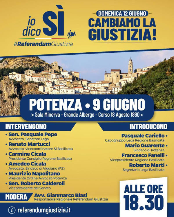 Giovedì 9 giugno, al Grande Albergo di Potenza, a partire dalle 18:30, incontro dei promotori del “sì” ai quesiti del referendum del 12 giugno.