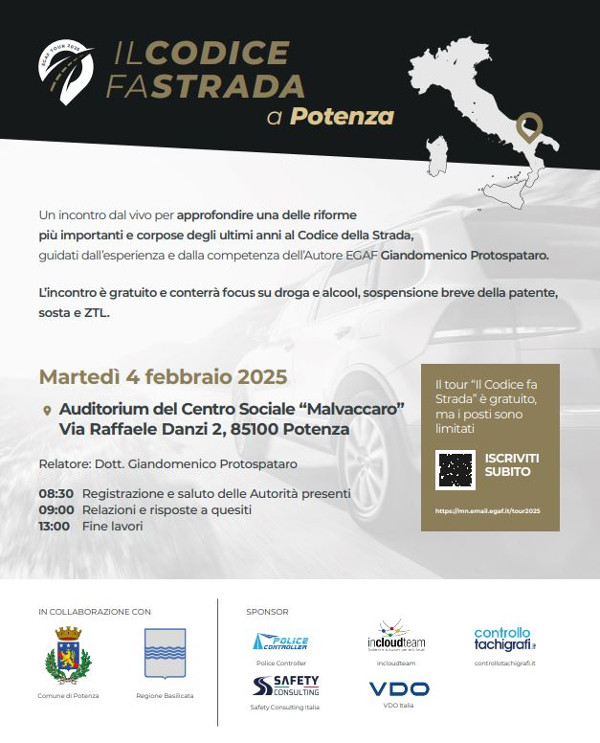 Si terrà martedì 4 febbraio 2025, con inizio alle 8,30 nell’auditorium del Centro Sociale ‘Malvaccaro’, in via Raffaele Danzi n.2, l’incontro organizzato da Egaf: ‘Il Codice fa strada’, voluto per approfondire una delle riforme più importanti e corpose degli ultimi anni al Codice della Strada.