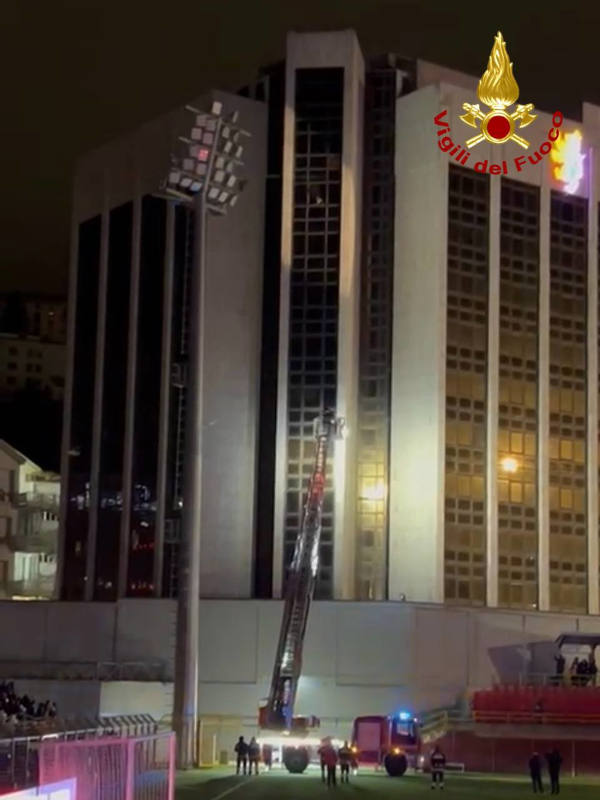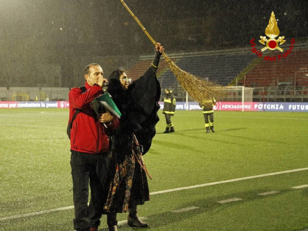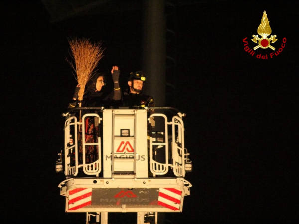 Il momento clou della giornata è arrivato alle 17:00, quando la Befana ha fatto il suo ingresso sul rettangolo verde grazie al salvataggio dei Vigili del Fuoco.