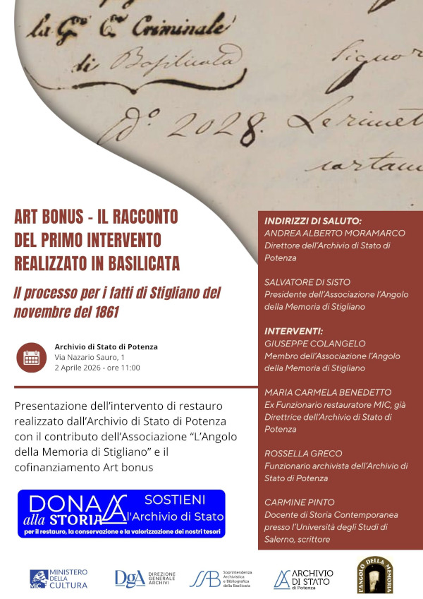 Sarà presentato presso l’Archivio di Stato di Potenza l’intervento di restauro realizzato nell’ambito del programma Art Bonus, reso possibile grazie ad una importante donazione dell’Associazione “L’Angolo della Memoria” di Stigliano.