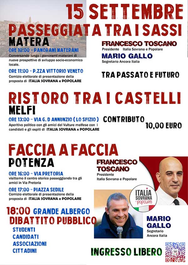 Giovedì 15 Settembre, dalle ore 18:00, presso la sala del Grande Albergo di Potenza avrà luogo la prossima rilevante tappa lucana della campagna elettorale di “Italia Sovrana e Popolare”.