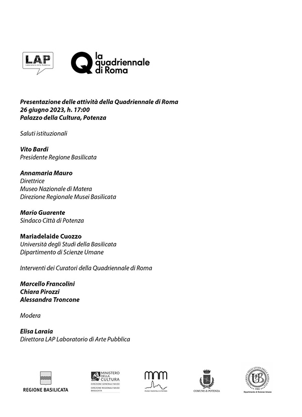 Lunedì 26 Giugno 2023, alle ore 17.00 si terrà presso Palazzo della Cultura a Potenza la presentazione delle attività della Quadriennale di Roma, l’istituzione nazionale per l’arte contemporanea italiana.