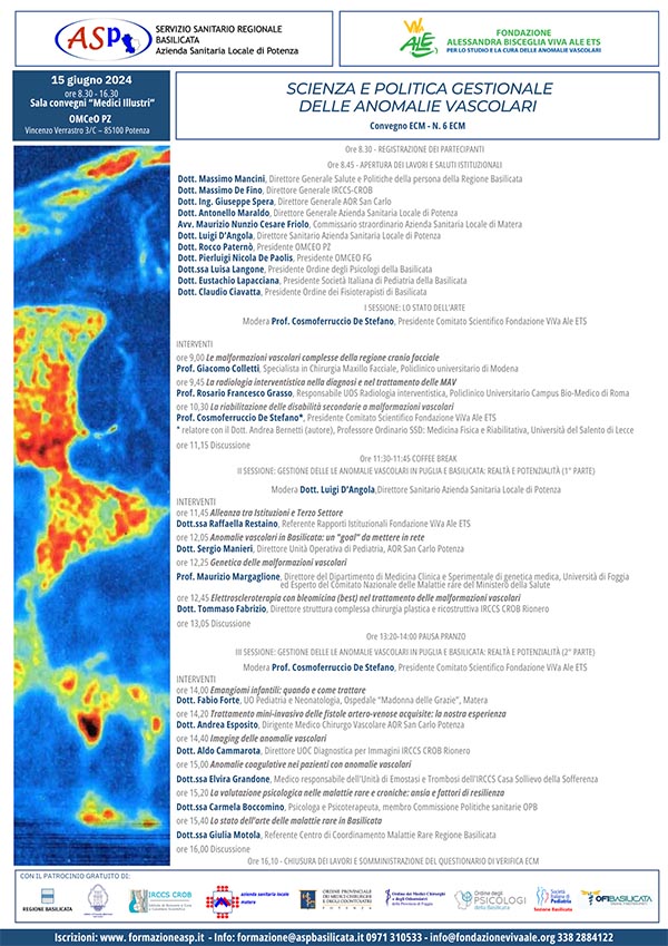 Un evento di formazione e aggiornamento sulle anomalie vascolari, per favorire la diagnosi precoce e il miglior percorso di cura da parte dei professionisti del sistema sanitario, si svolgerà domani 15 giugno a Potenza, con inizio alle ore 8.30, nella sala Formazione “Medici Illustri” dell’Ordine dei Medici Chirurghi e degli Odontoiatri di Potenza in via Vincenzo Verrastro, 3/C (palazzina di fronte al palazzo della giunta regionale).