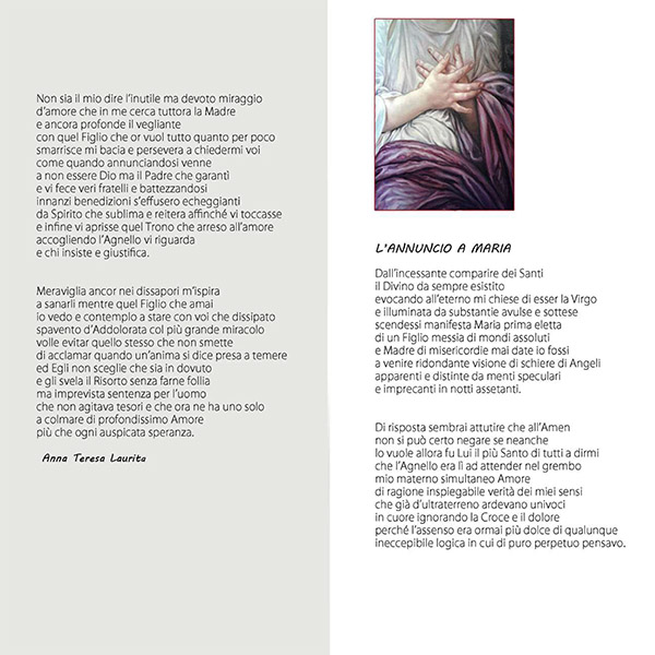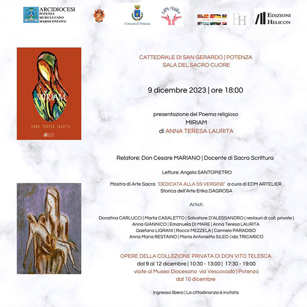 Si terrà il 9 Dicembre 2023 presso la Cattedrale di San Gerardo, in via Vescovado a Potenza nella Sala del Sacro Cuore alle 18.00, la presentazione del poema sacro Miriam di Anna Teresa Laurita – relatore Don Cesare Mariano (docente di sacra scrittura) e letture di Angela Santopietro.