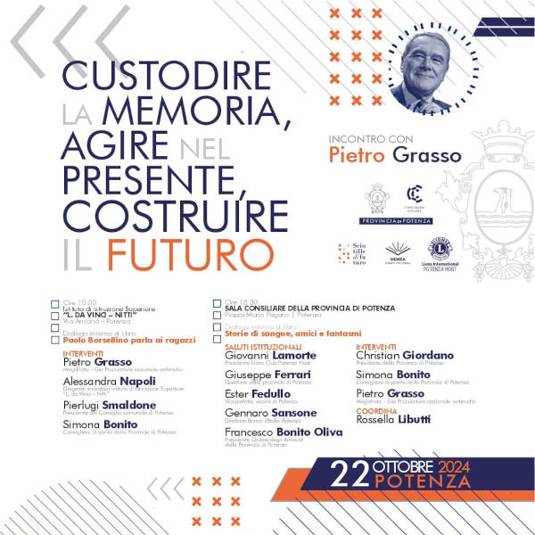“Custodire la memoria, agire nel presente, costruire il futuro”; è questo il fil rouge dell’iniziativa in programma per il prossimo 22 ottobre 2024 nata dalla collaborazione tra la Provincia di Potenza e il Lions Club Potenza Host, che vedrà la partecipazione del magistrato e già Procuratore nazionale antimafia, Pietro Grasso.