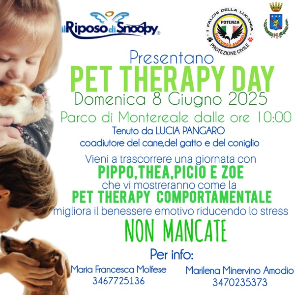 Domenica 8 Giugno 2025 presso il Parco di Montereale a Potenza dalle ore 10:00, si terrà la giornata “Pet therapy Day” organizzata da Maria Francesca Molfese, referente della squadra di protezione civile di Potenza “I Falchi della Lucania HANA Soccorso Animali”, e Marilena Minervino Amodio, responsabile de “Il Riposo di Snoopy – Cimitero e Cremazione Animali”.