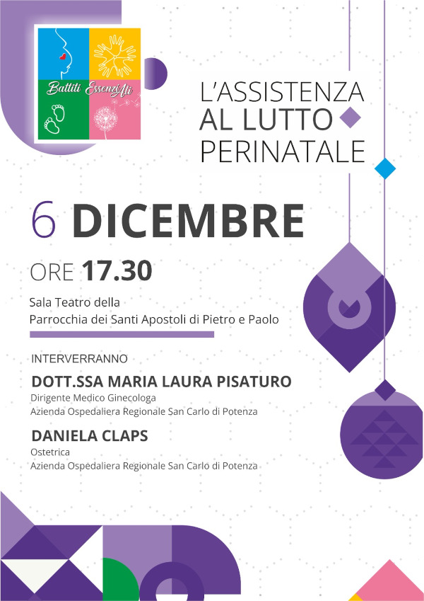 E’ in programma oggi pomeriggio 6 Dicembre alle ore 17:30, nella sala teatro della chiesa SS. Pietro e Paolo a Potenza, un incontro informativo dal titolo “L’assistenza al lutto perinatale” che vedrà la presenza di Maria Laura Pisaturo, dirigente medico ginecologa e dell’ostetrica Daniela Claps, entrambe operanti presso l’ospedale “San Carlo” di Potenza.
