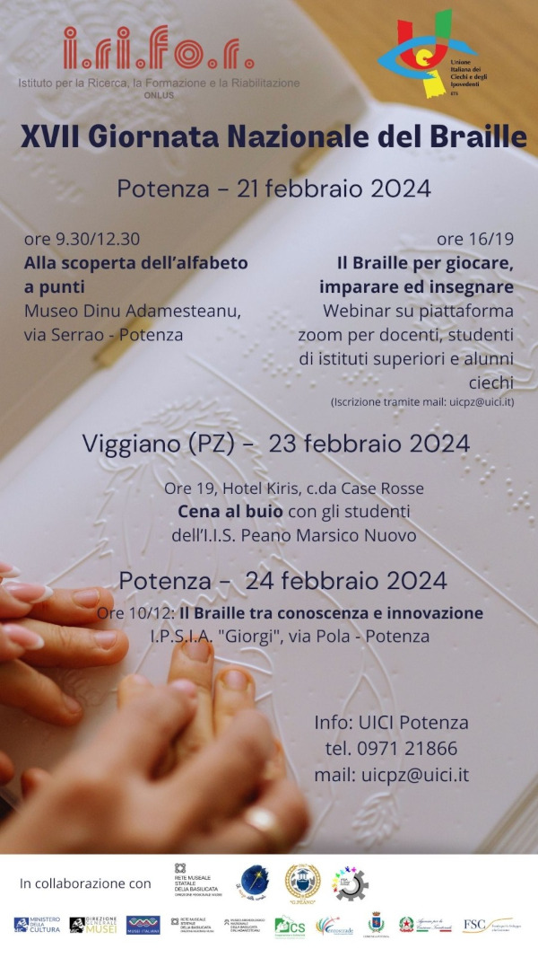In occasione della XVII Giornata Nazionale del Braille la sezione UICI di Potenza organizza un ricco cartellone di eventi in collaborazione con l’I.Ri.Fo.R., la Rete Museale Statale di Basilicata, il progetto “Il Mago delle Comete”, l’I.I.S. Peano di Marsico Nuovo e I.P.S.I.A. “Giorgi” di Potenza.