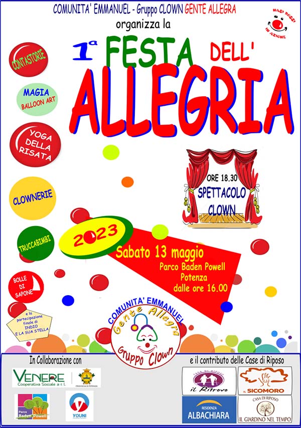 Il giorno 13 Maggio 2023 il Gruppo Clown GENTE ALLEGRA – Comunità Emmanuel organizza presso il Parco Baden Powell a Potenza una intera giornata di festa durante la quale l’Allegria appunto sarà il filo conduttore.