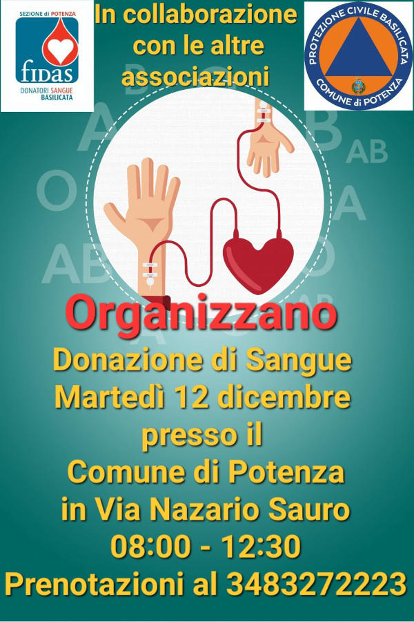 Martedì 12 dicembre 2023, nel piazzale del Mobility Center, sede municipale di via Nazario Sauro, dalle ore 8 alle ore 12,30, la Fidas insieme alla Protezione civile comunale, organizzano una mattinata dedicata alla donazione di sangue.