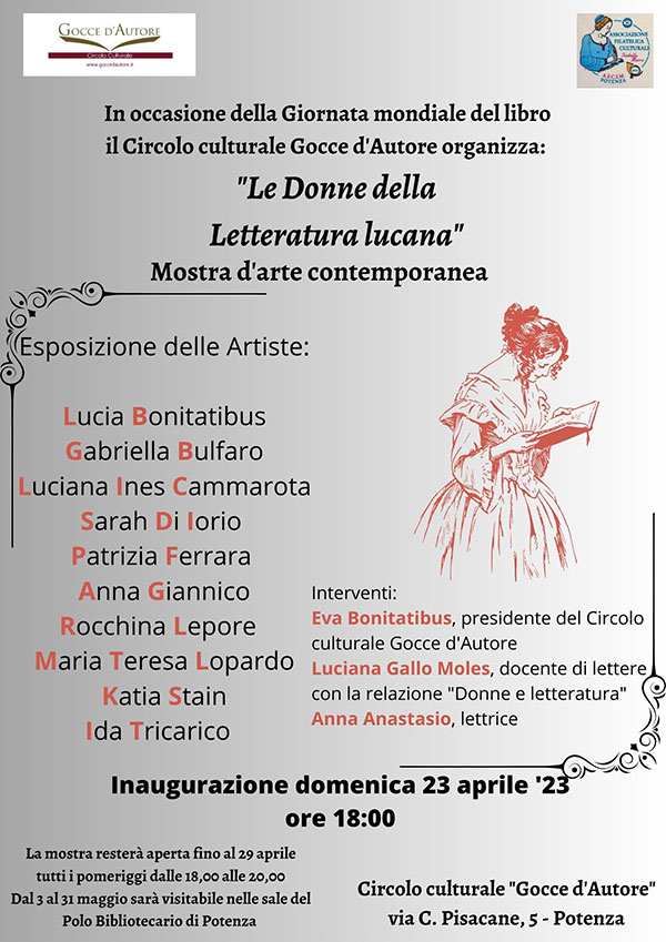 “Le Donne della Letteratura lucana” è il titolo della mostra d’arte contemporanea organizzata dal Circolo culturale Gocce d’Autore per celebrare la Giornata mondiale del libro e del diritto d’autore.
