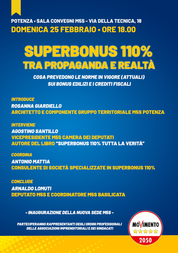 Domenica, 25 febbraio alle ore 18.00, presso la sala convegni del MoVimento 5 Stelle di Potenza, in via della Tecnica n. 18, si svolgerà un incontro sul tema “Superbonus 110% tra propaganda e realtà. Informazioni agli operatori e ai cittadini sulle norme attuali in materia di bonus edilizi e crediti fiscali”.