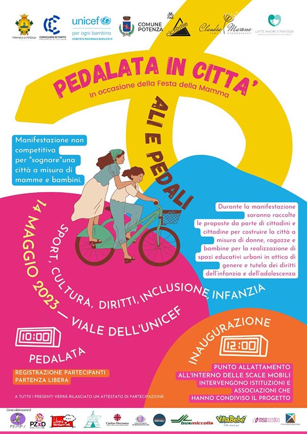 A Potenza in occasione della Festa della mamma 2023, il prossimo 14 maggio, la Consigliera di Parità della Provincia di Potenza, l’assessorato alla Sport del Comune di Potenza, Unicef Basilicata, e l’associazione CiclOstile FIAB Basilicata, organizzano una pedalata non competitiva in Via dell’Unicef (chiusa al traffico per l’occasione) dalle ore 10:00 alle ore 13:00 con l’obiettivo di promuovere la mobilità su due ruote e sensibilizzare all’utilizzo della bicicletta come mezzo di trasporto nonché favorire la relazione tra madri e figli attraverso le pratiche sportive.
