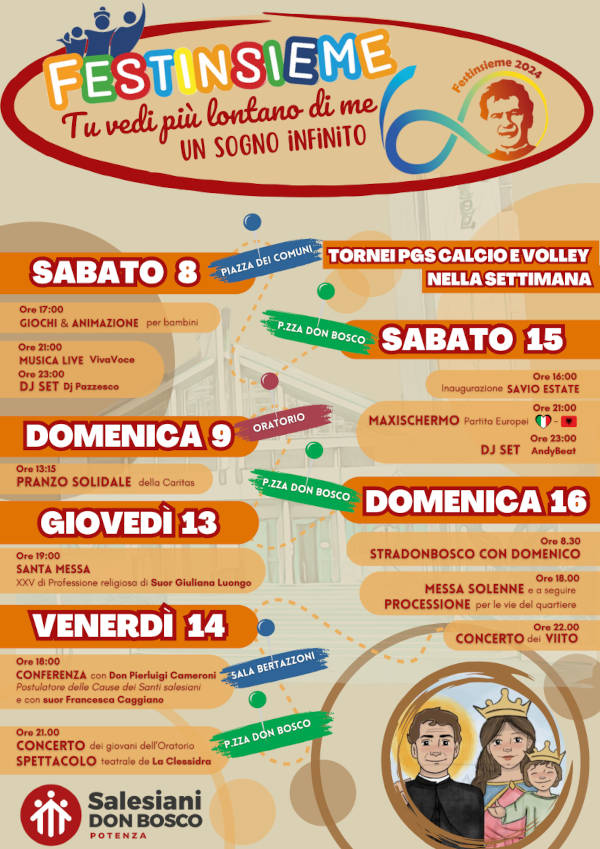 Nel 60° anniversario la parrocchia ripropone Festinsinsieme 2024, un’intensa settimana di eventi di carattere culturale, artistico, sportivo, musicale e religioso che coinvolgeranno non solo il nostro quartiere, ma l’intera città.