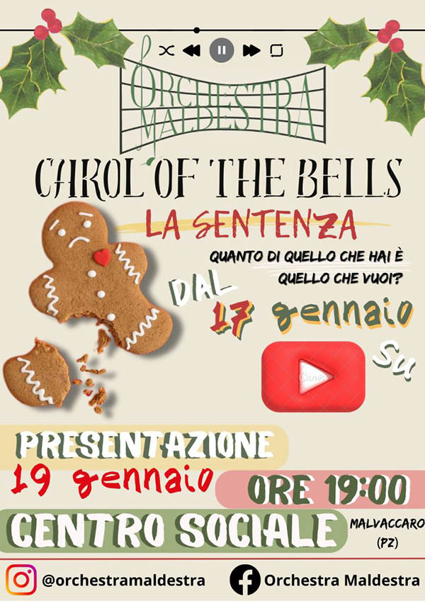 Venerdì 19 Gennaio alle ore 19:00, nell’Auditorium del Centro Sociale di Malvaccaro, andrà in scena ‘Carol of the bells’, concerto-spettacolo della Orchestra Maldestra.