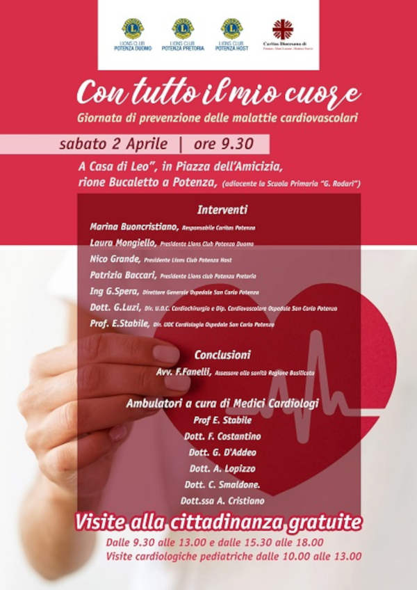 Sabato 2 aprile 2022 (dalle ore 9:30), presso il Centro di Aggregazione e accompagnamento alla Famiglia “A Casa di Leo” della Caritas Diocesana di Potenza, Muro Lucano, Marsico Nuovo, in piazza dell’Amicizia al rione Bucaletto di Potenza partirà una manifestazione dal particolare valore simbolico, “Con tutto il mio cuore”: una occasione per fare concretamente prevenzione delle malattie cardiovascolari.